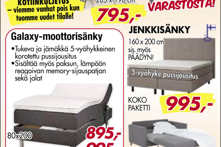 Avokulmasohva: 795,00 €. Koko 285 x 190 cm. Heti varastosta! Galaxy-moottorisänky: tukeva ja jämäkkä 5-vyöhykkeinen korotettu pussijousitus. Sisältää myös paksun, lämpöön reagoivan memory-sijauspatjan sekä jalat. 80 x 200 cm: 895,00 €, 90 x 200 cm: 995,00 €, 105 x 200 cm ja 120 x 200 cm: 1425,00 €. Kotimainen jenkkisänky 160 x 200 cm, sisältää…