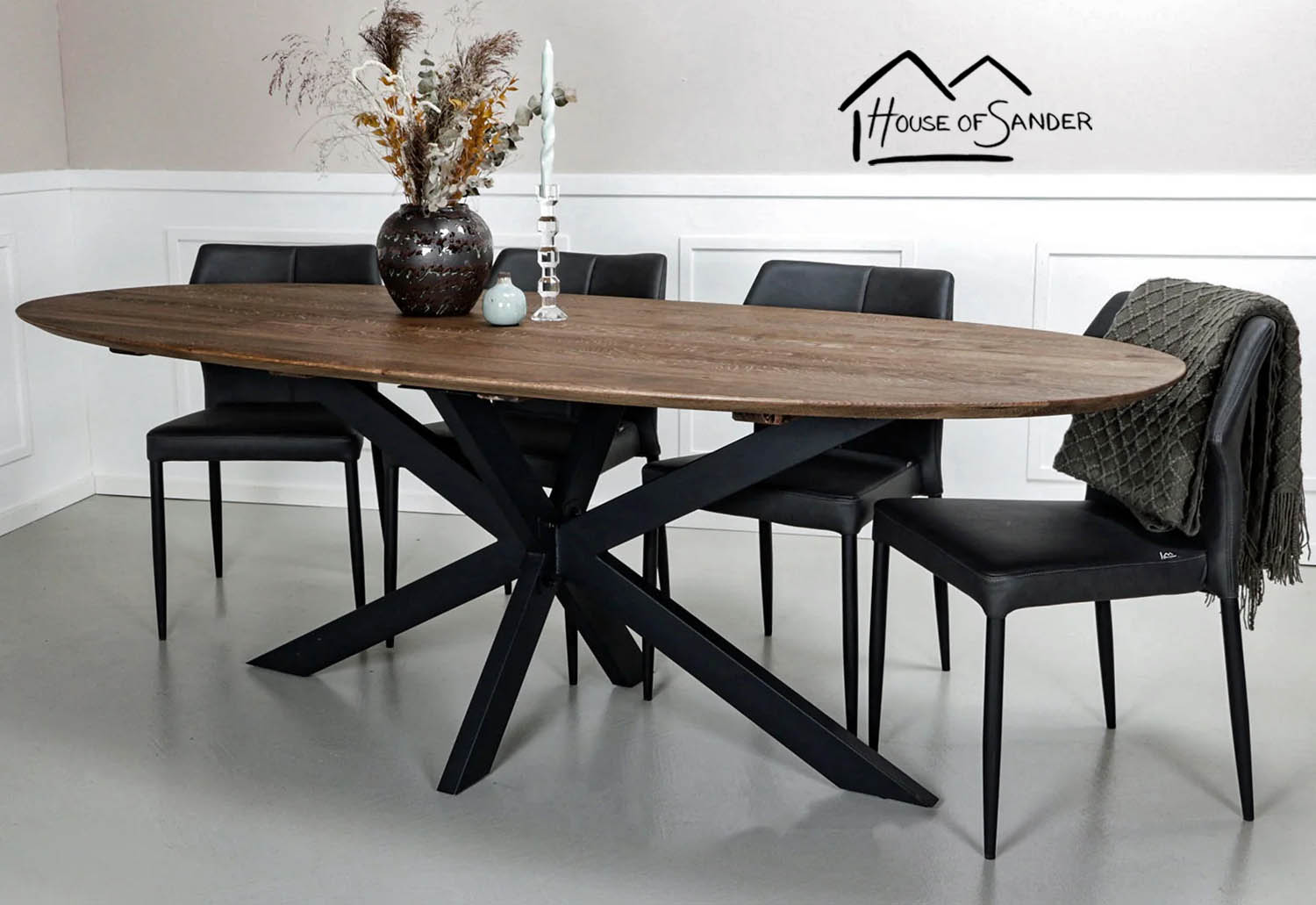 Massiivitamminen pöytä mustalla metallisella ristikkojalalla.