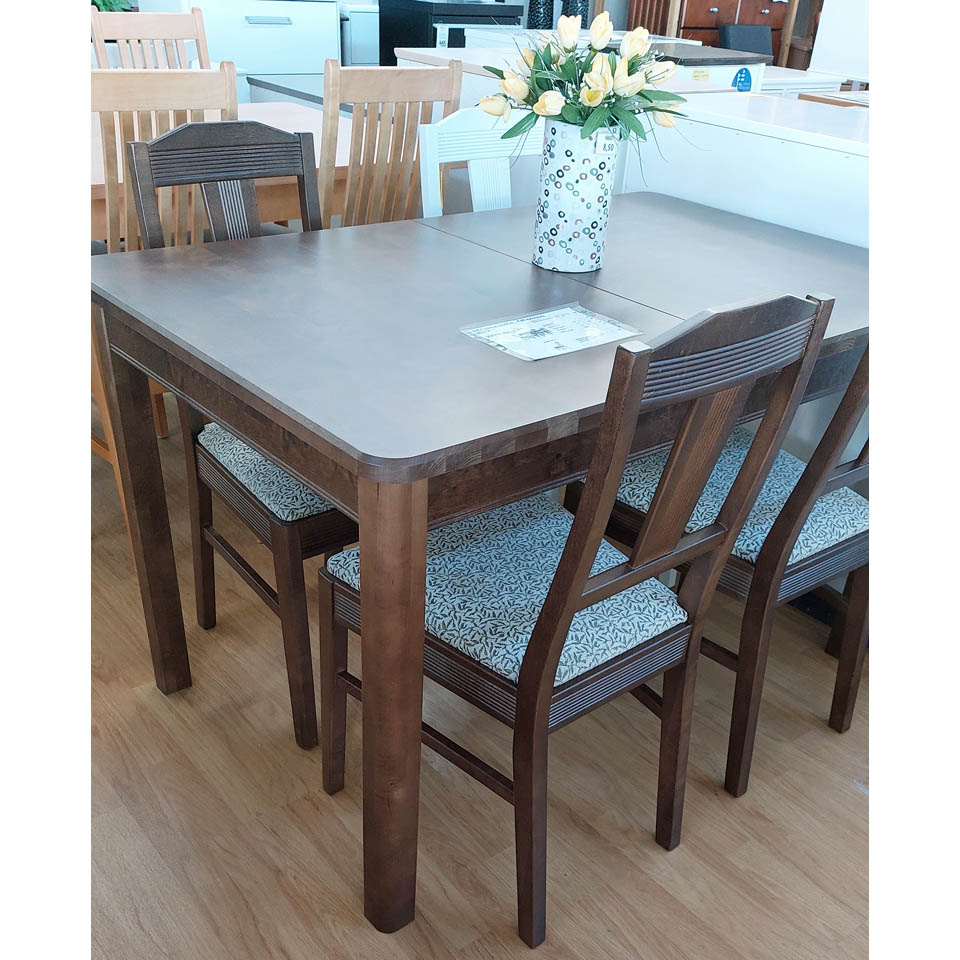 Valitse pöytään mieleisesi tuolit, kuvan verhoillut saman valmistajan koivutuolit 257,00 € /kpl.