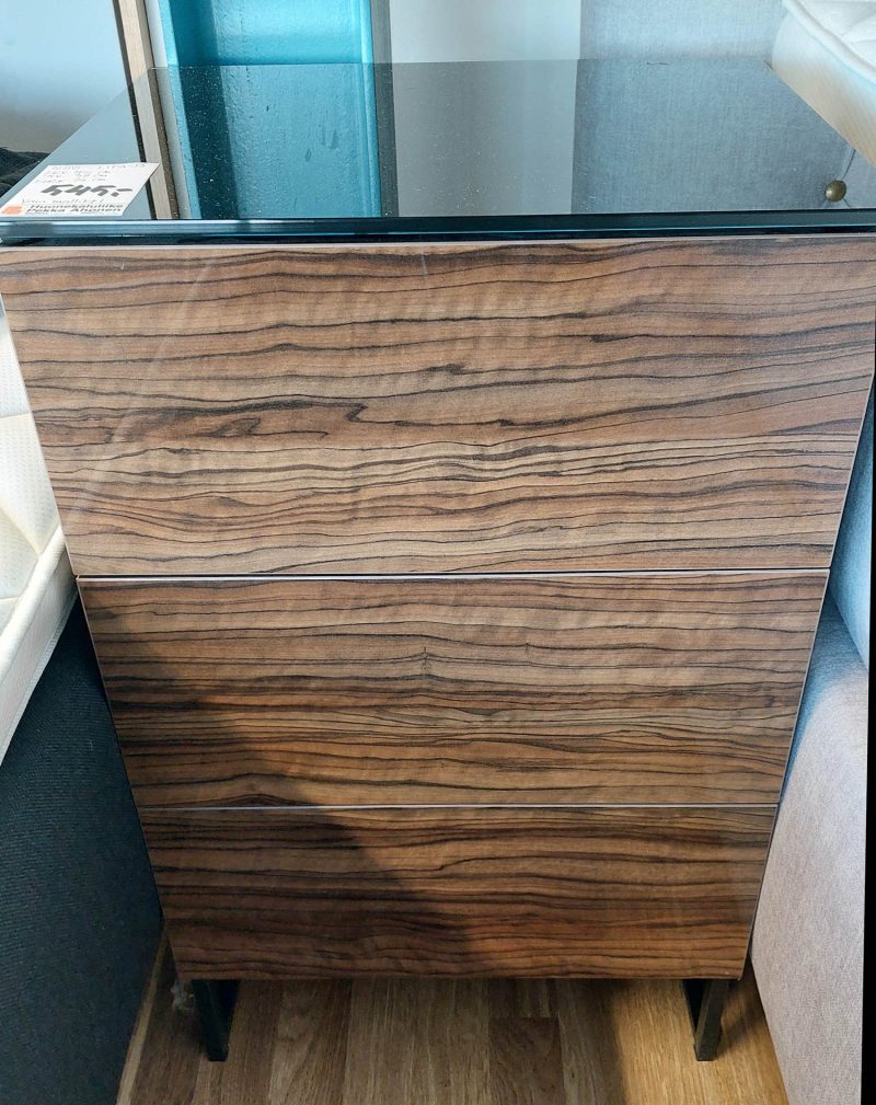 Paksu musta lasikansi, laatikoiden etusarjat kiiltävää oliivipuu-kuviota. Runko musta, mustat metallijalat.